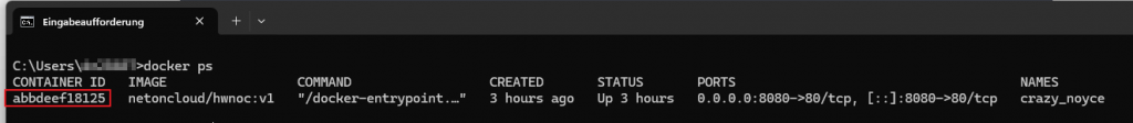 A very useful parameter for further operations is the “CONTAINER ID“. It referred the running instance of a container image as it is possible to run many separate instance of the same docker image (you must only use a different local TCP port like 8081, 8082 etc..).