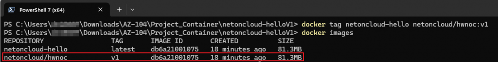 docker tag netoncloud-hello netoncloud/hwnoc:v1
