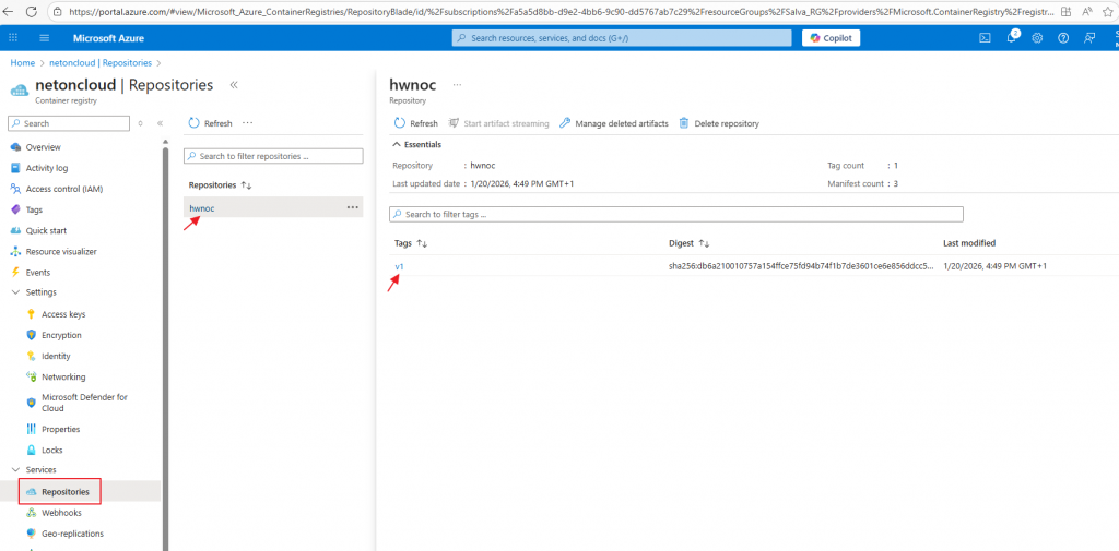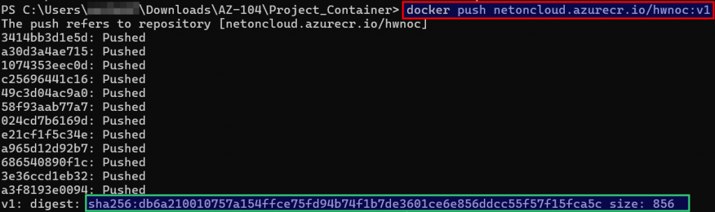 AZ-104 Exam Tip: Understanding image digests is important. Unlike tags (which can be overwritten), digests are immutable identifiers. In production, you can reference images by digest for guaranteed consistency: youracrname.azurecr.io/hwnoc@sha256:abc123...