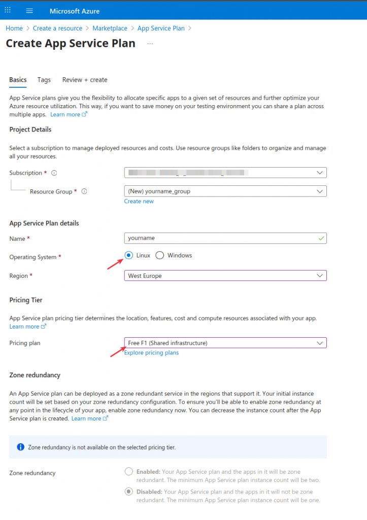 Pricing Tier: for this lab, select Free F1: No cost, limited resources (1 GB RAM, 60 CPU minutes/day). This Tier is sufficient for this lab but does not support scaling or production workloads.