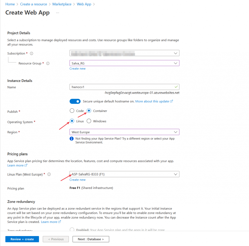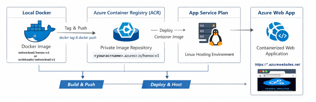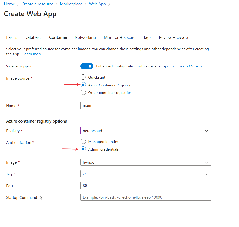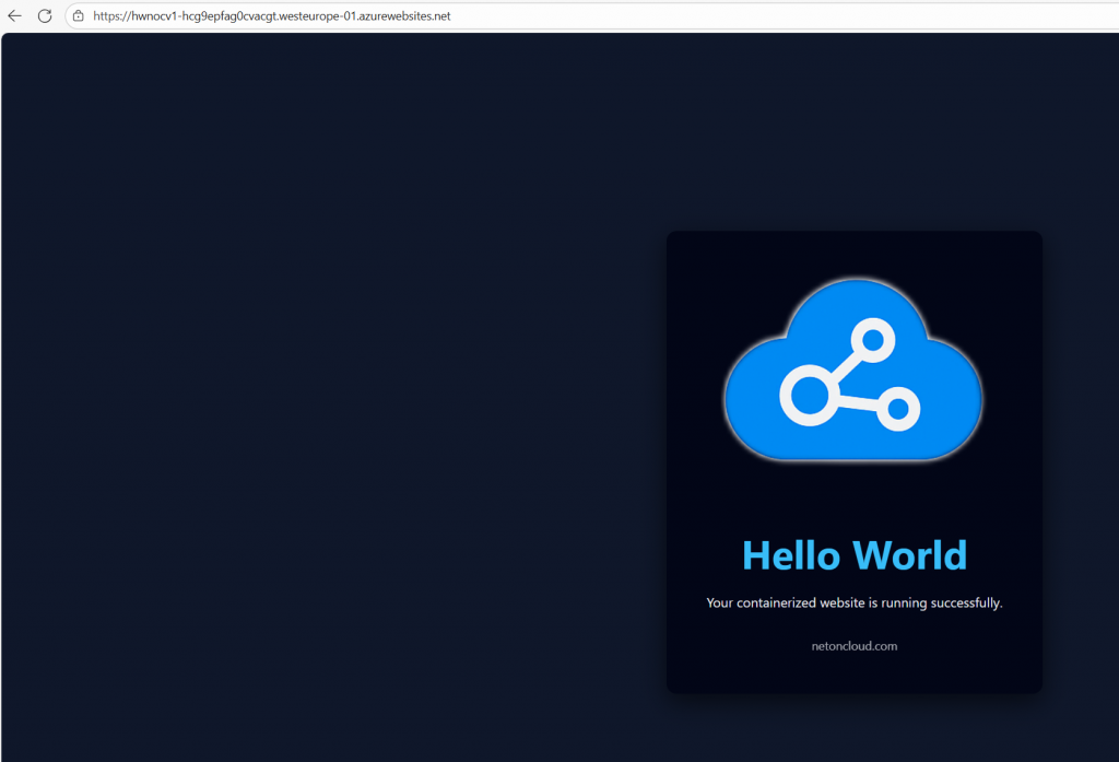 netoncloud.azurecr.io/hwnoc:v1 - App Service Plan: your app service plan name