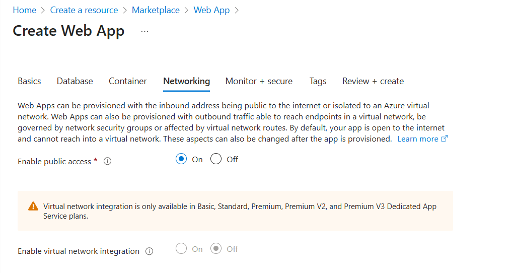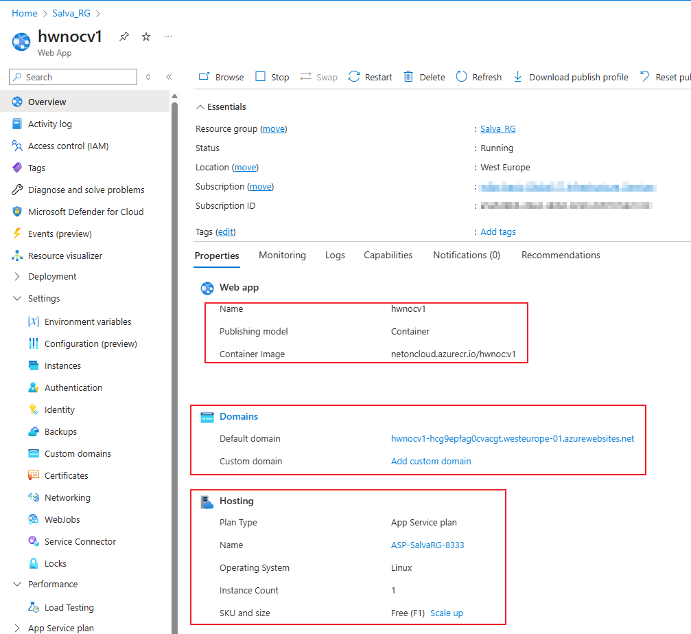 - Default domain: Your public URL (e.g., hwnoc-d2ecf3cwgybce3g0.westeurope-01.azurewebsites.net)