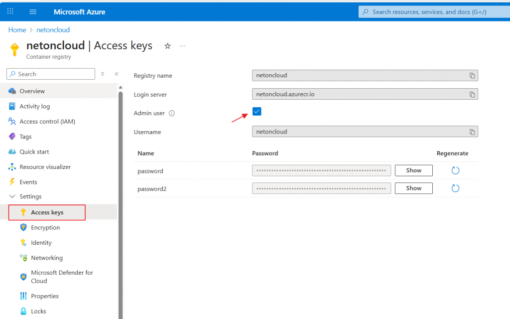 Enabling the Admin user provides a username and password that can be used by Docker and App Services for authentication.