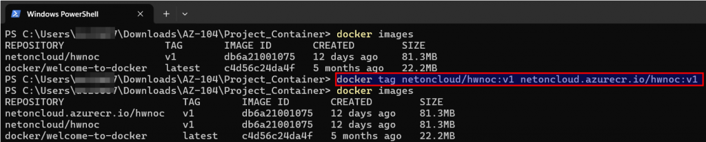 docker tag netoncloud/hwnoc:v1 youracrname.azurecr.io/hwnoc:v1